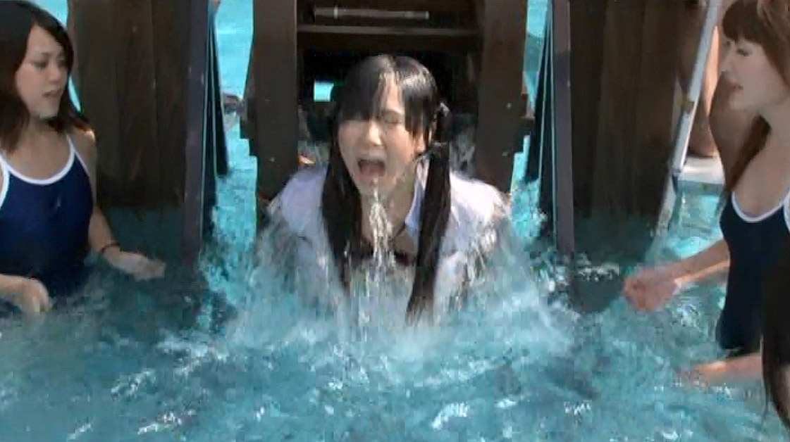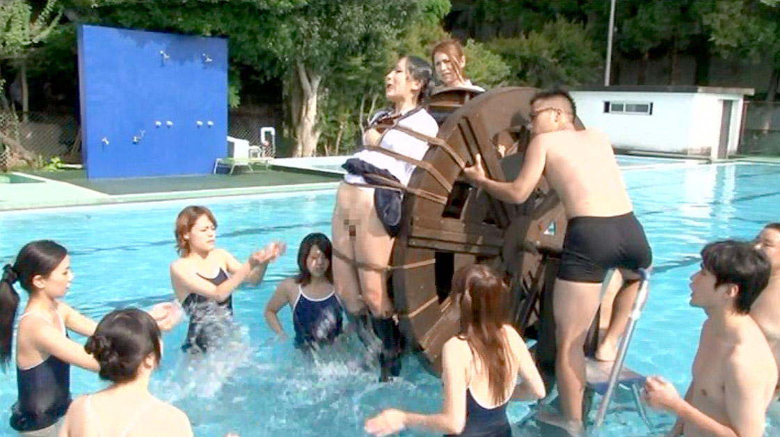 首を縛られ、足を縛られ、プールに放り込まれ両方から引っ張られる拷問的いじめを受ける女子。