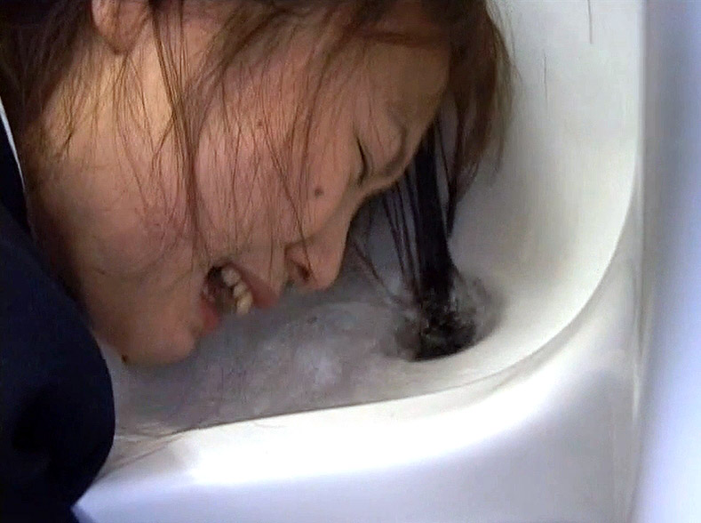 水を流され、便器の排水溝に髪の毛が吸い込まれていく姿が、惨めさを強調する。