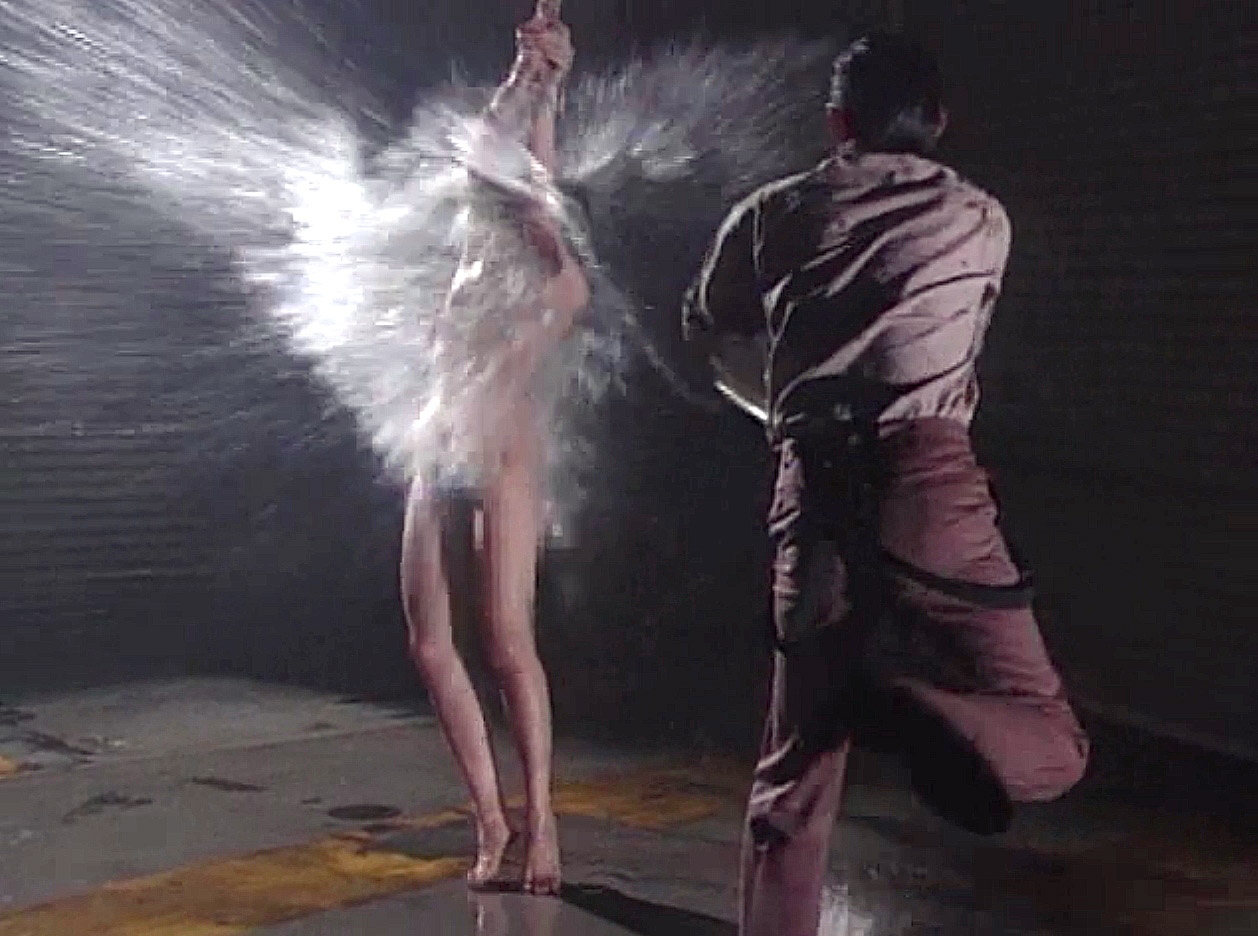 幾度も幾度も体に容赦なく水を叩きつけられて吹っ飛ぶ女、ようこ。