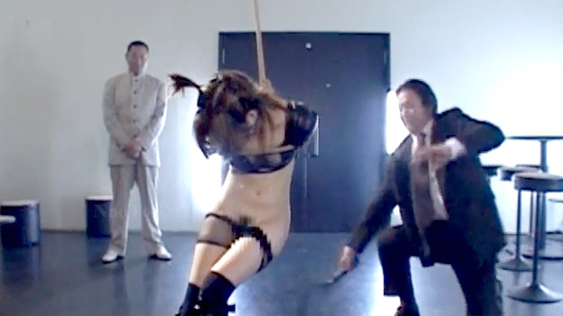 ショーツを半分おろされたエロい姿で激しく鞭の乱打を受ける女、凛。