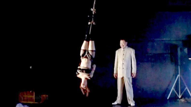 逆さ吊りにされて振り子のように振られ成すすべもなくされるがままに苦しむ女、凛。