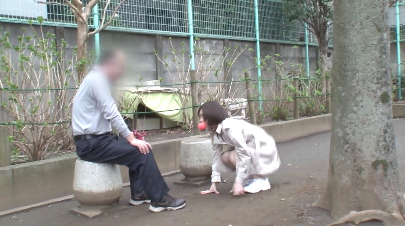 野外露出調教で公園で這いつくばってボールを咥えさせられる奴隷女、あいり。