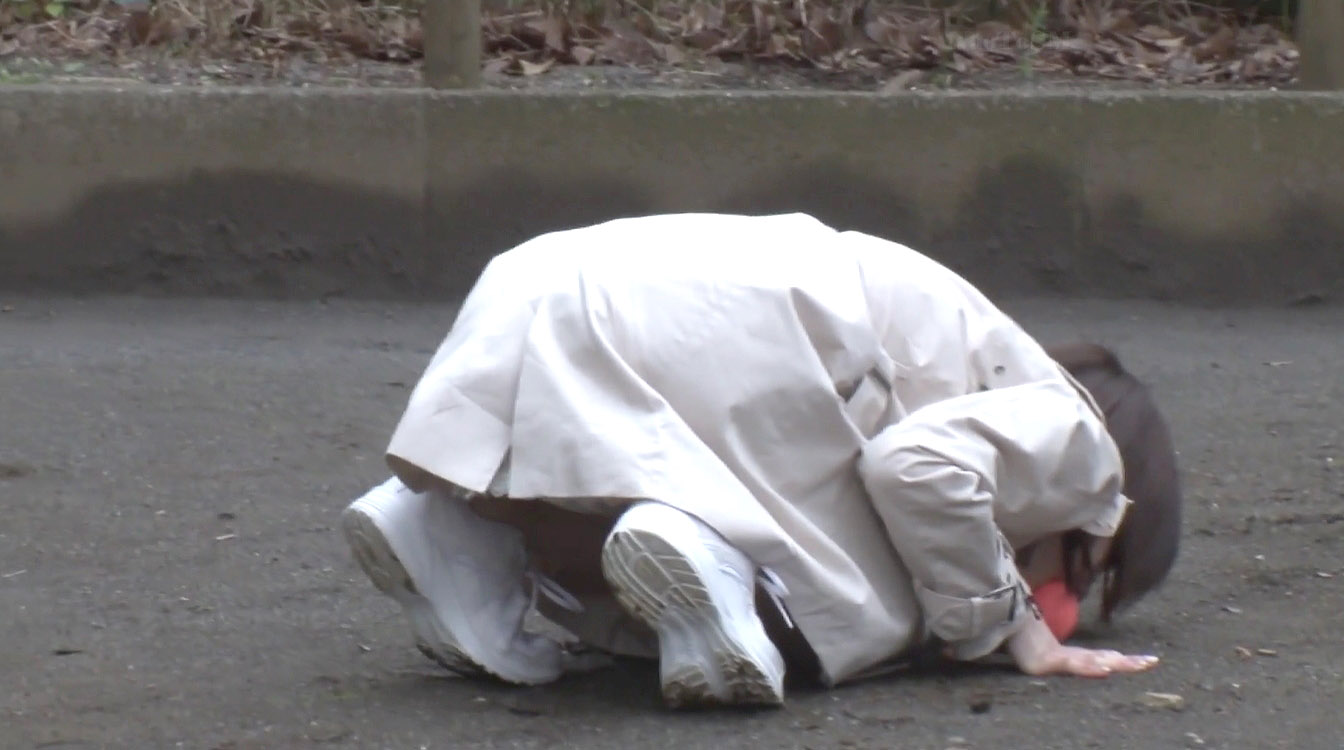 野外の公園で主の足元に跪いて座らされる惨めな野外調教を受ける女、あいり。