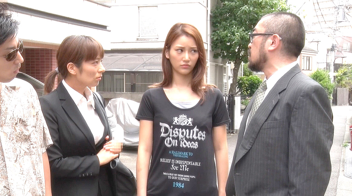 男たちに言いがかりをつけられて困りながらも強気な表情で対応する女、奈央。